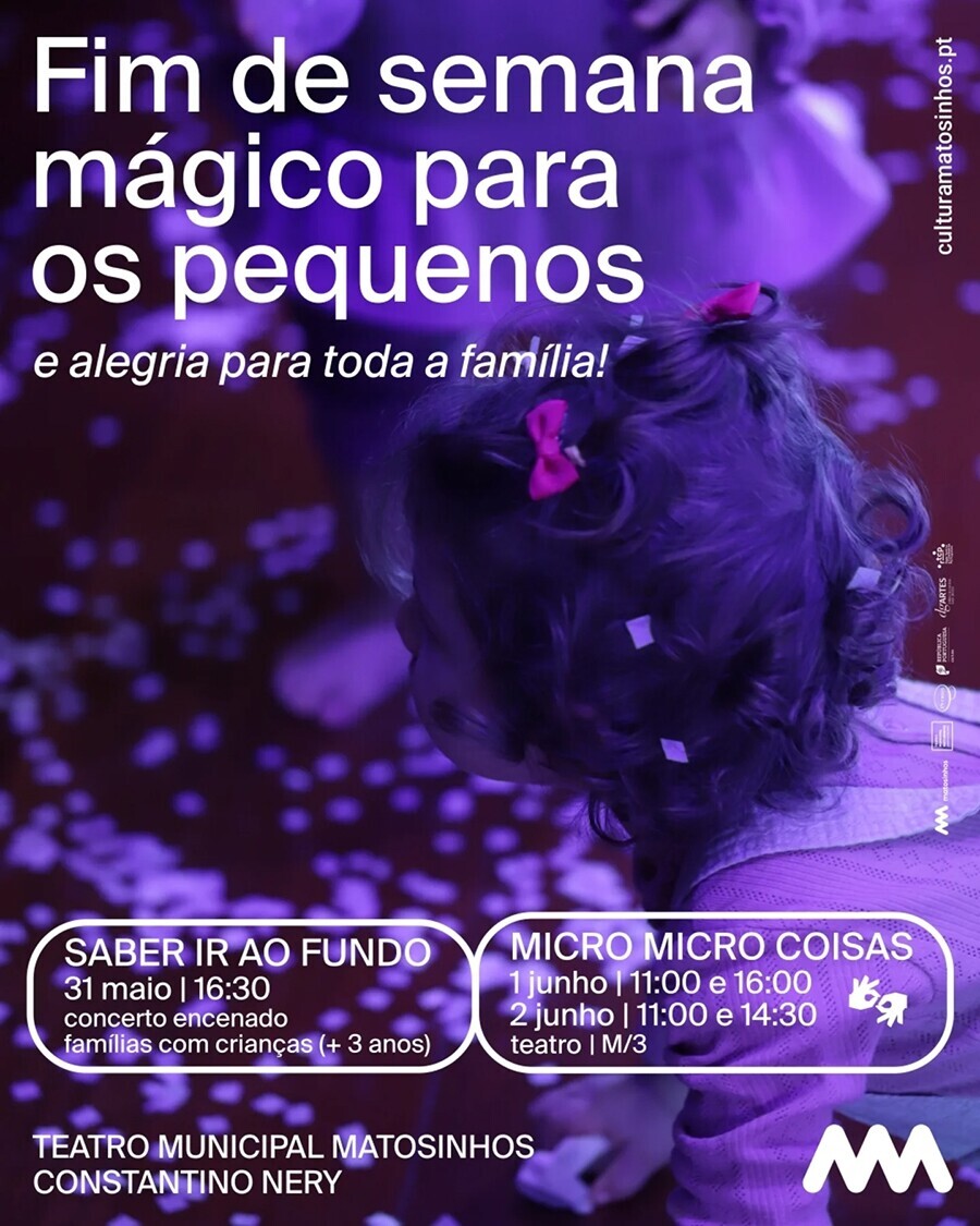 O Teatro Municipal de Matosinhos Constantino Nery também se associa às comemorações do Dia Mundial da Criança, com dois espetáculos pensados para o público infantil e familiar. No dia 31 de maio, pelas 16h30, não perca “Saber ir ao Fundo”, da companhia Frenesim, um concerto encenado com Miguel Ramos, que convida crianças e adultos a refletirem, de forma poética, sobre os grandes temas da vida. Já “micro micro coisas”, da Plataforma285, propõe, no dia 1 de junho, uma viagem sensorial ao mundo do invisível e do imaginado, com interpretação em Língua Gestual Portuguesa.