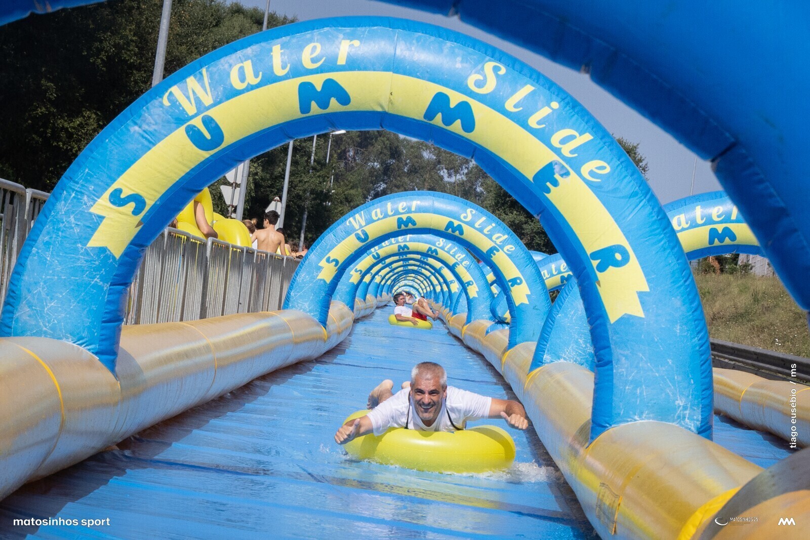 Na inauguração oficial do “Water Slide Summer” marcaram presença Carlos Mouta, vice-presidente da Câmara de Matosinhos, Nuno Matos, vereador do Desporto, e Leonardo Fernandes, presidente da União das Freguesias de S. Mamede de Infesta e Senhora da Hora.