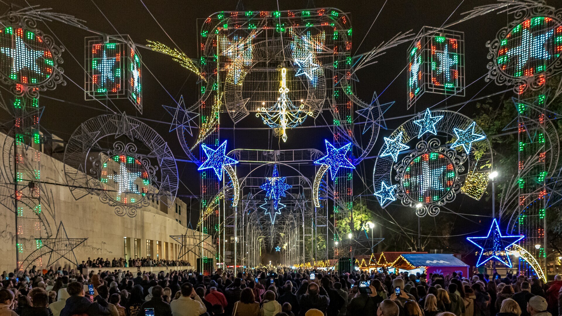 No exterior do edifício dos Paços do Concelho, uma espécie de “túnel” formado por arcos ilumina-se num ritmo sincronizado com música natalícia e outros efeitos digitais visuais, atraindo, como habitualmente, milhares de pessoas a este espetáculo multimédia.