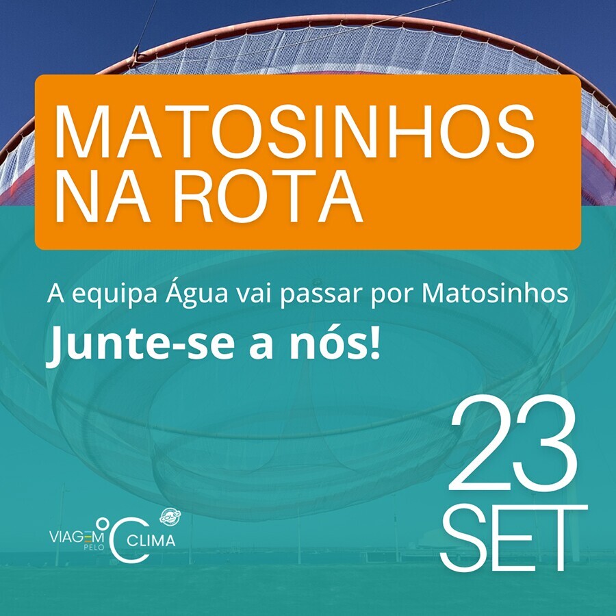 No dia 23 de setembro, a equipa Água estará em Matosinhos para promover a Rota de Sustentabilidade Municipal, destacando e incentivando práticas mais ecológicas nos estabelecimentos comerciais do município, promovendo a adoção de soluções que ajudem a reduzir a pegada ambiental, nomeadamente a app Get2Zero para calcular a pegada de carbono dos negócios e cidadãos. Ainda em Matosinhos, a equipa Água irá visitar uma escola do município para incentivar os jovens a participarem na Mini COP.