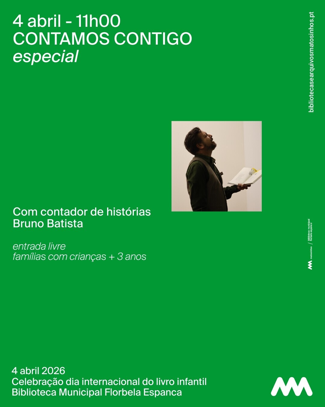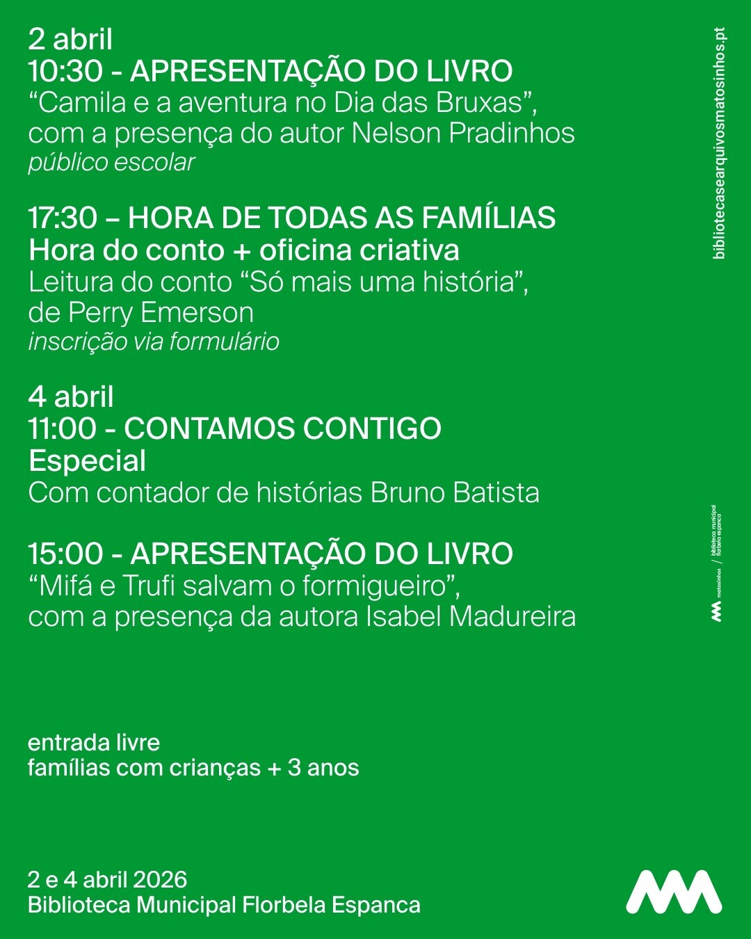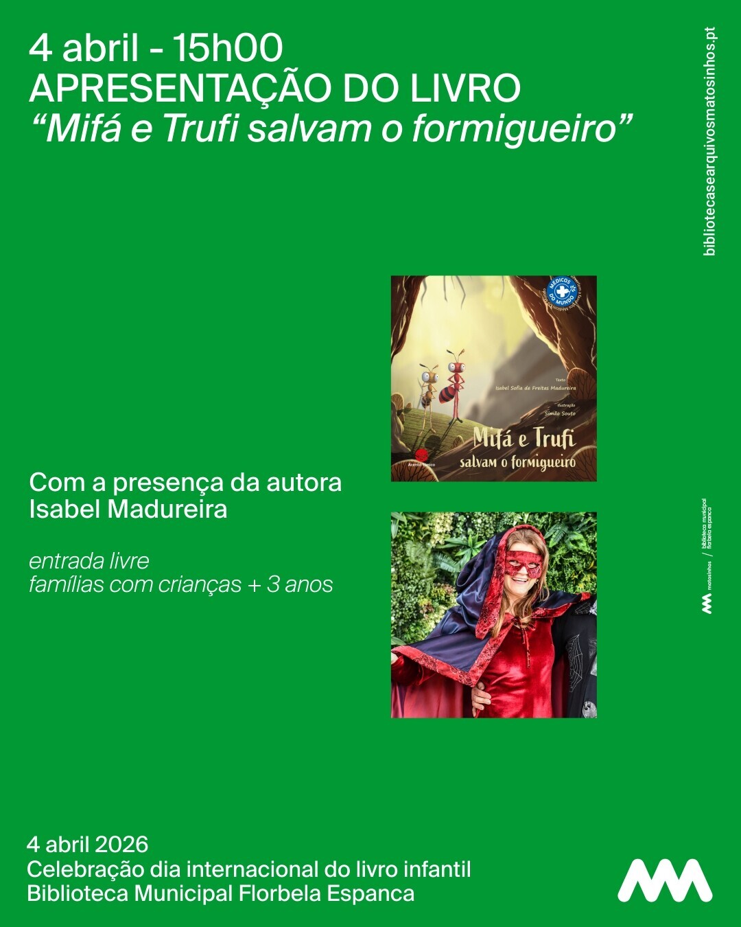 No sábado, dia 4, a aventura continua! Teremos uma sessão especial do Contamos Contigo, com o contador de histórias Bruno Batista, que nos desafia a uma busca divertida… à procura dos ovos da Páscoa! E à tarde, recebemos a autora Isabel Madureira e o seu livro "Mifá e Trufi salvam o formigueiro", em mais um momento de encontro entre leitores, autores e histórias que inspiram.