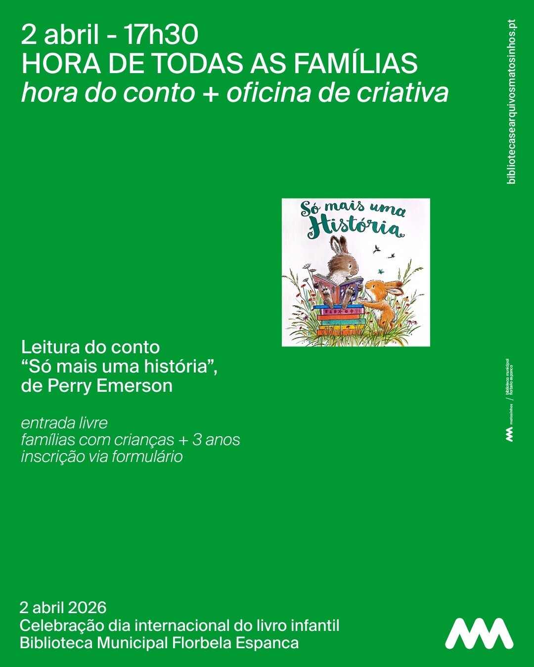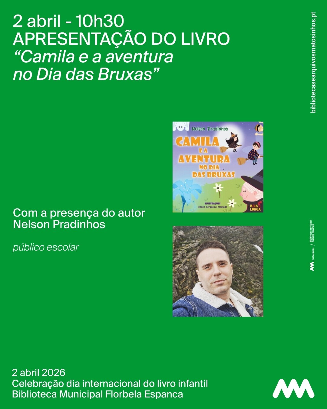 No dia 2, damos início à festa com a apresentação do livro "Camila e a aventura no Dia das Bruxas", com a presença do autor Nelson Padrinhos, numa sessão dedicada ao público escolar. Ao final do dia, convidamos as famílias e os pequenos leitores para mais uma Hora de Todas as Famílias, onde vamos mergulhar na narrativa “Só mais uma história” de Perry Emerson, e dar asas à imaginação numa oficina criativa.