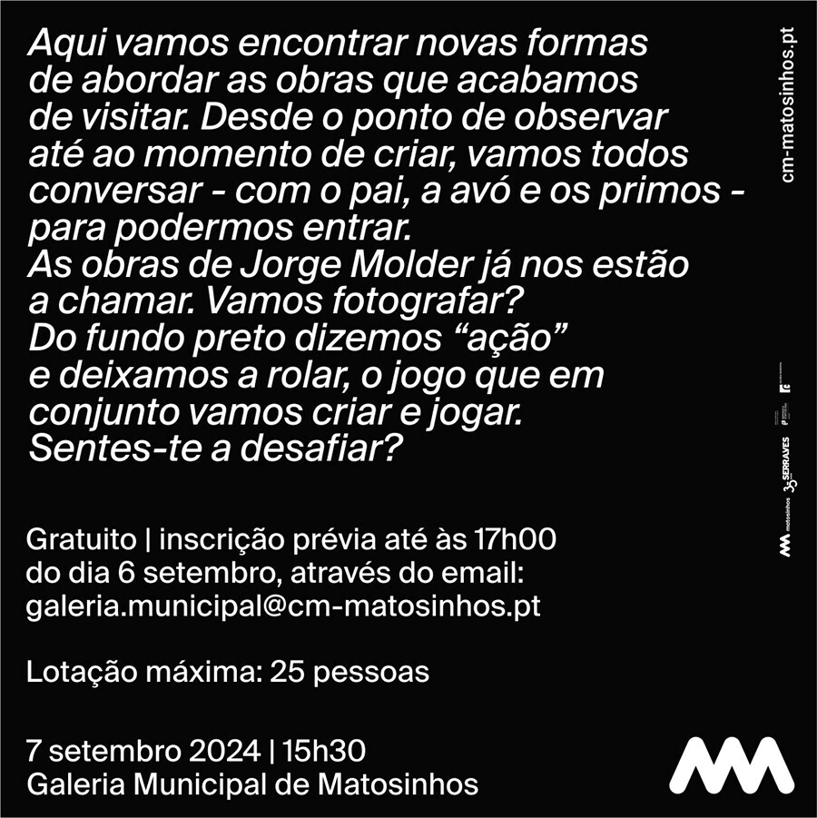 O acesso é gratuito, mas requer inscrição prévia até às 17h00 do dia 6 de setembro, através do e-mail galeria.municipal@cm-matosinhos.pt, uma vez que a lotação está limitada a 25 pessoas.