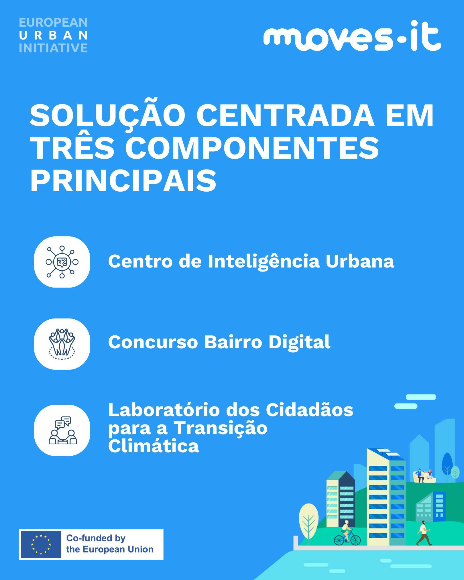 O MOVES-IT tem como objetivo transformar a forma como a cidade planeia e toma decisões, combinando inteligência urbana, participação cívica e criatividade. A iniciativa estrutura-se em três componentes interligadas: o Centro de Inteligência Urbana (UIC), que funcionará como hub de interoperabilidade para recolha e análise de dados relacionados com as áreas verdes e azuis do concelho e com os comportamentos sustentáveis da população; o Concurso Bairro Digital, um modelo inovador e gamificado de envolvimento comunitário que apoia o desenvolvimento de projetos-piloto locais; e a expansão do Laboratório dos Cidadãos para a Transição Climática (LABIC), espaço dedicado à cocriação de soluções participativas com o contributo de artistas locais.