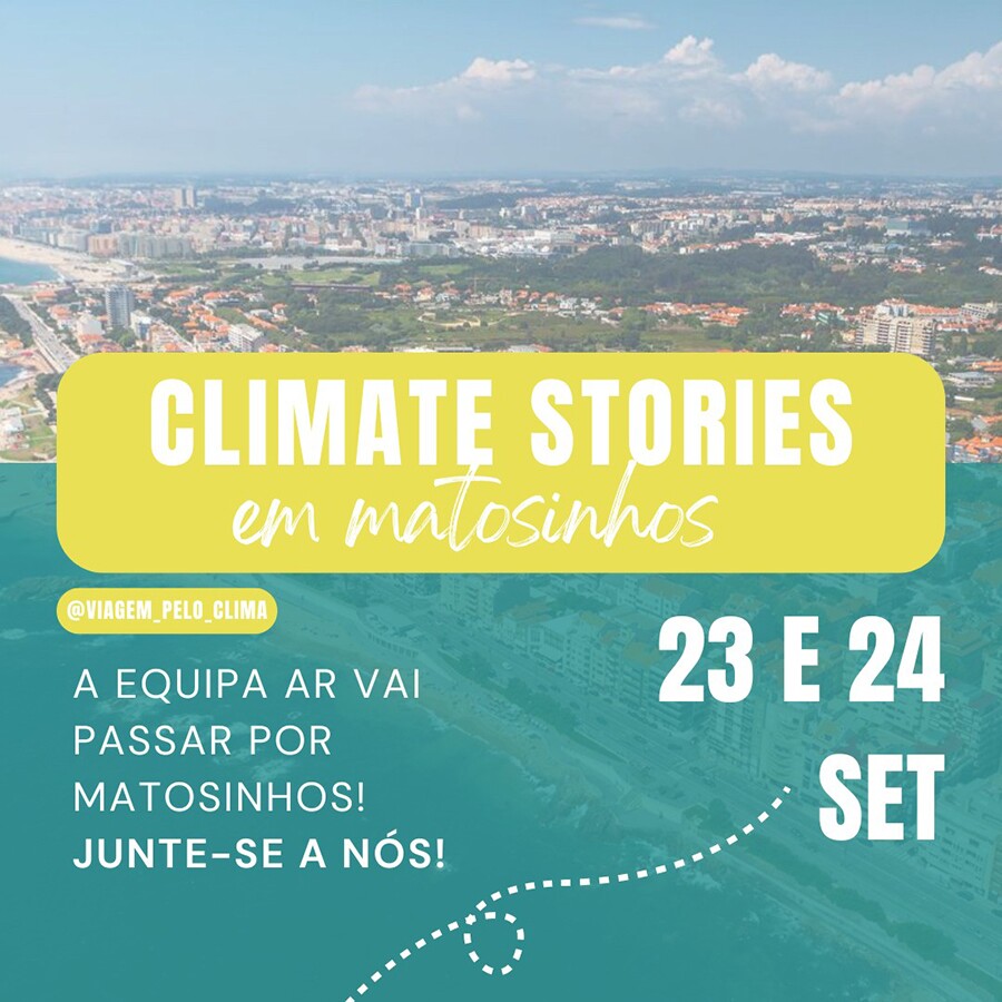 Em Matosinhos, a Equipa Ar da Viagem pelo Clima irá realizar, nos dias 23 e 24 de setembro, as Climate Stories, destacando histórias e experiências de pessoas ou entidades que sejam inspiradoras à ação.