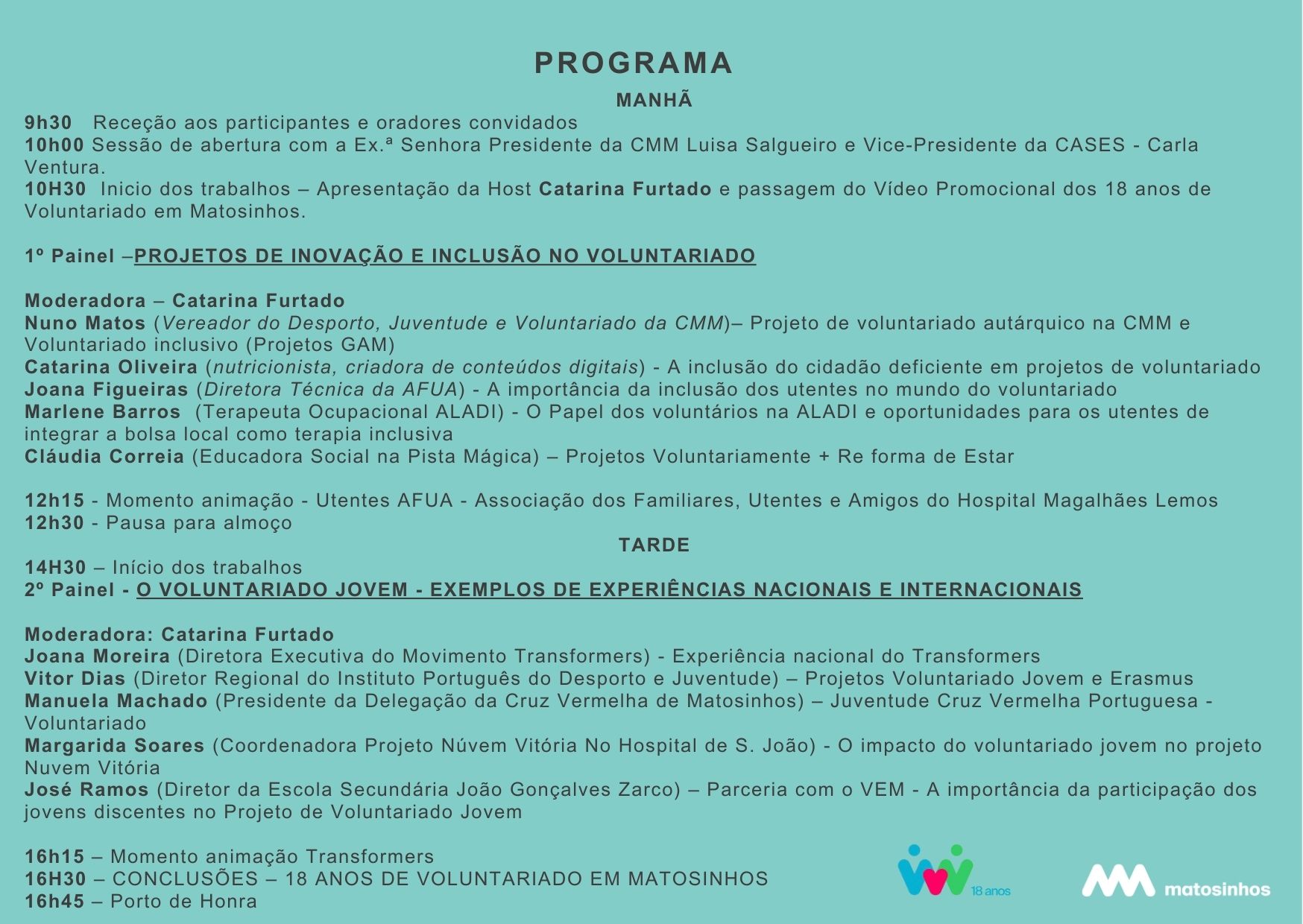 Adicionar a calendário2024-10-17 09:30:002024-10-17 09:30:00Europe/Lisbon18 Anos de Voluntariado em MatosinhosFórum com apresentação de Catarina FurtadoSalão Nobre da Câmara Municipal de Matosinhos