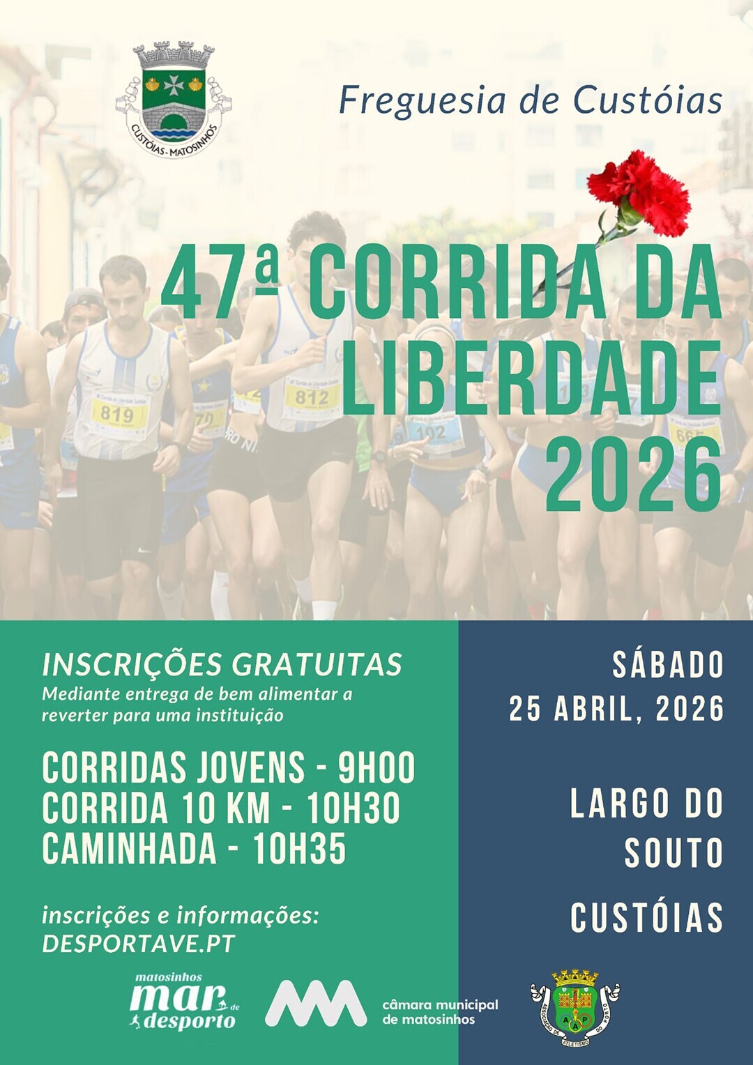 Adicionar a calendário2026-04-25 09:00:002026-04-25 09:00:00Europe/Lisbon47.ª Corrida da LiberdadeCorridas Jovens / Corrida 10Km / CaminhadaLargo do Souto, Custóias
