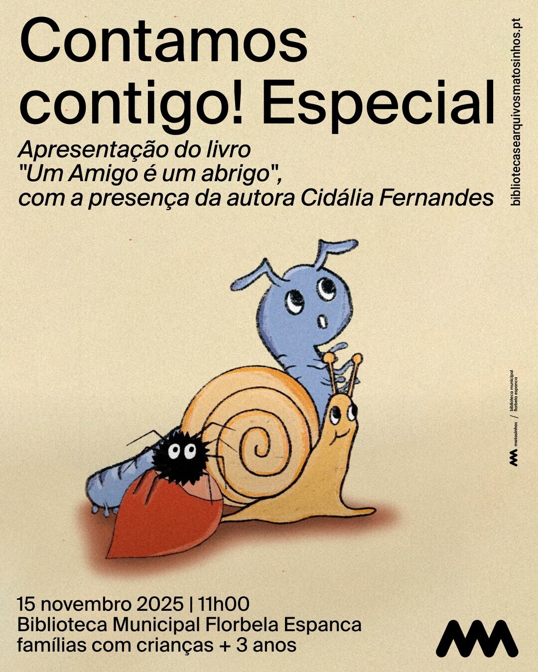 Adicionar a calendário2025-11-15 11:00:002025-11-15 11:00:00Europe/LisbonContamos contigo!Especial - Apresentação do livro “Um amigo é um abrigo”Biblioteca Municipal Florbela Espanca