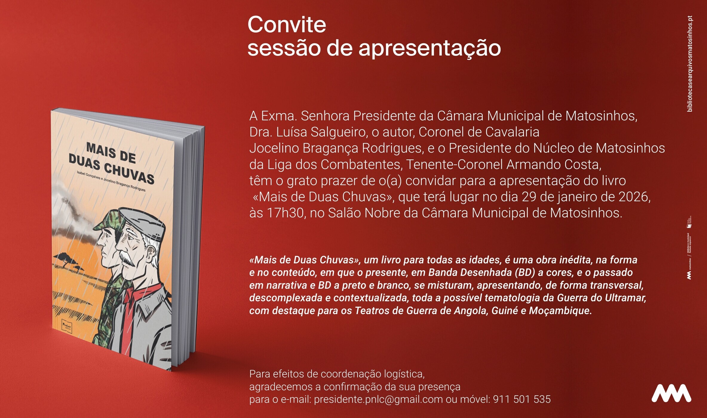 "Mais de Duas Chuvas", um livro para jovens de todas as idades, é uma obra inédita, na forma e no conteúdo, na qual o presente, em banda desenhada (BD) a cores, e o passado, em narrativa e BD a preto e branco, se cruzam, apresentando, de forma transversal, a temática da Guerra do Ultramar, com destaque para os teatros de guerra de Angola, Guiné e Moçambique.