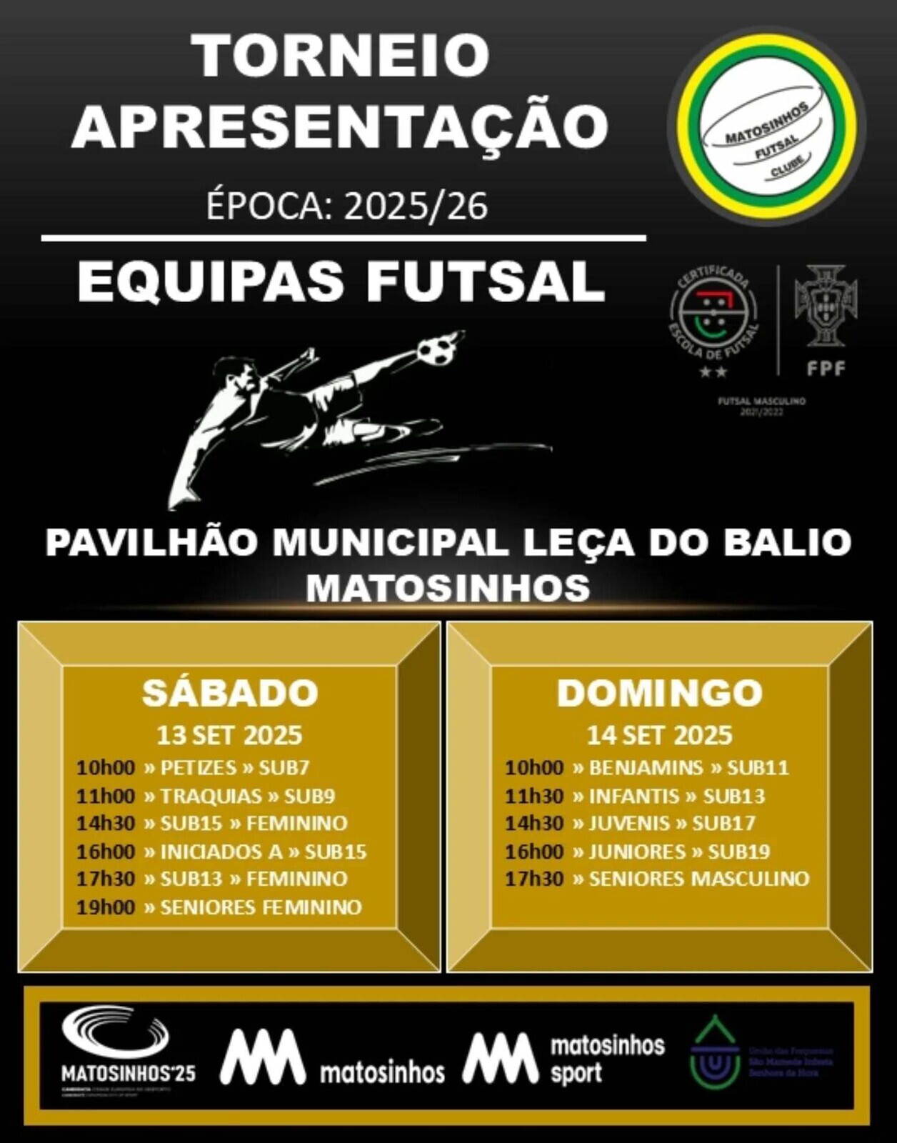 Adicionar a calendário2025-09-13 10:00:002025-09-14 17:30:00Europe/LisbonTorneio de Apresentação SolidárioMatosinhos Futsal ClubePavilhão Municipal de Leça do Balio