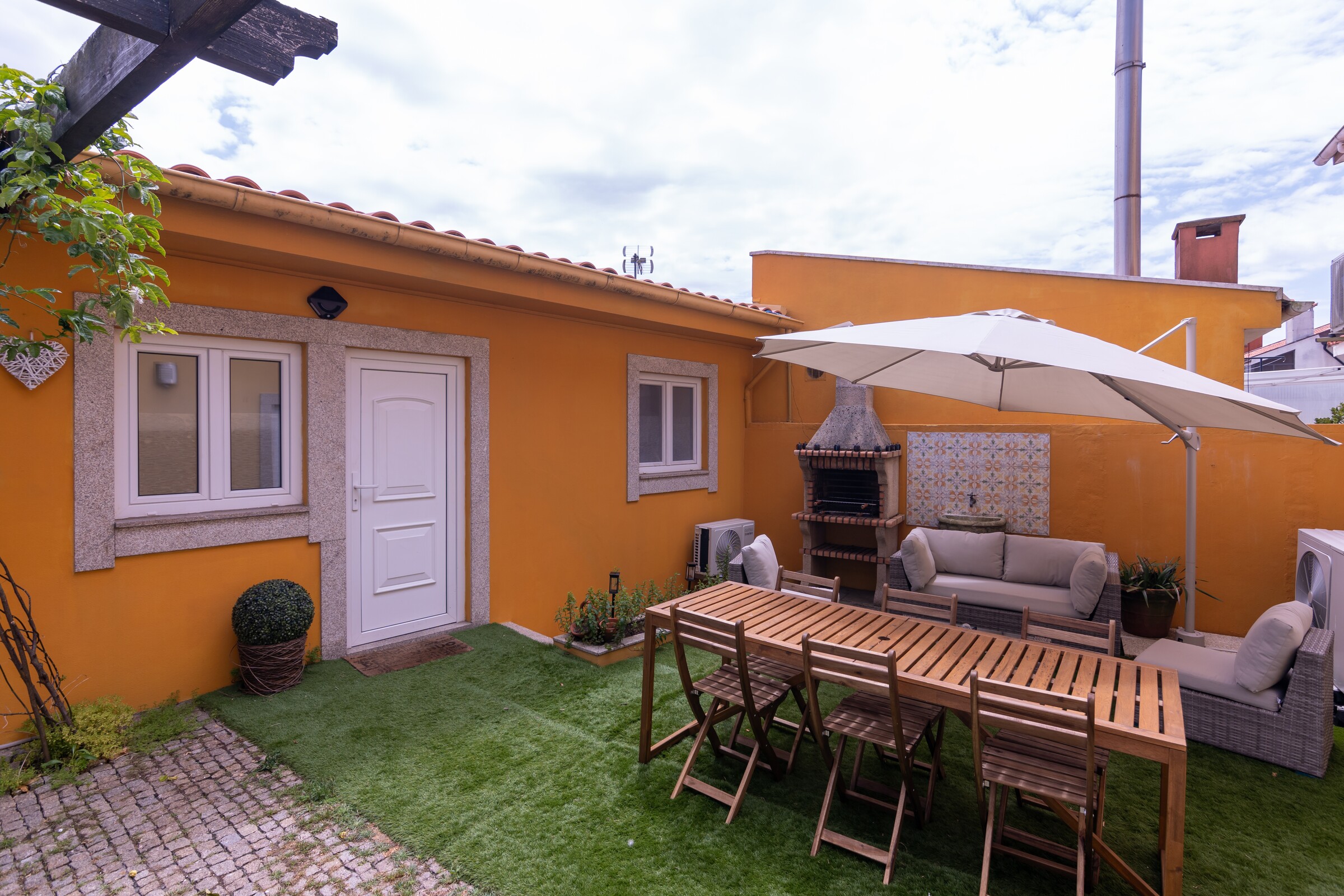 Casa de banho com duche de massagens e espaço exterior com zona de refeições, barbecue e sofá.